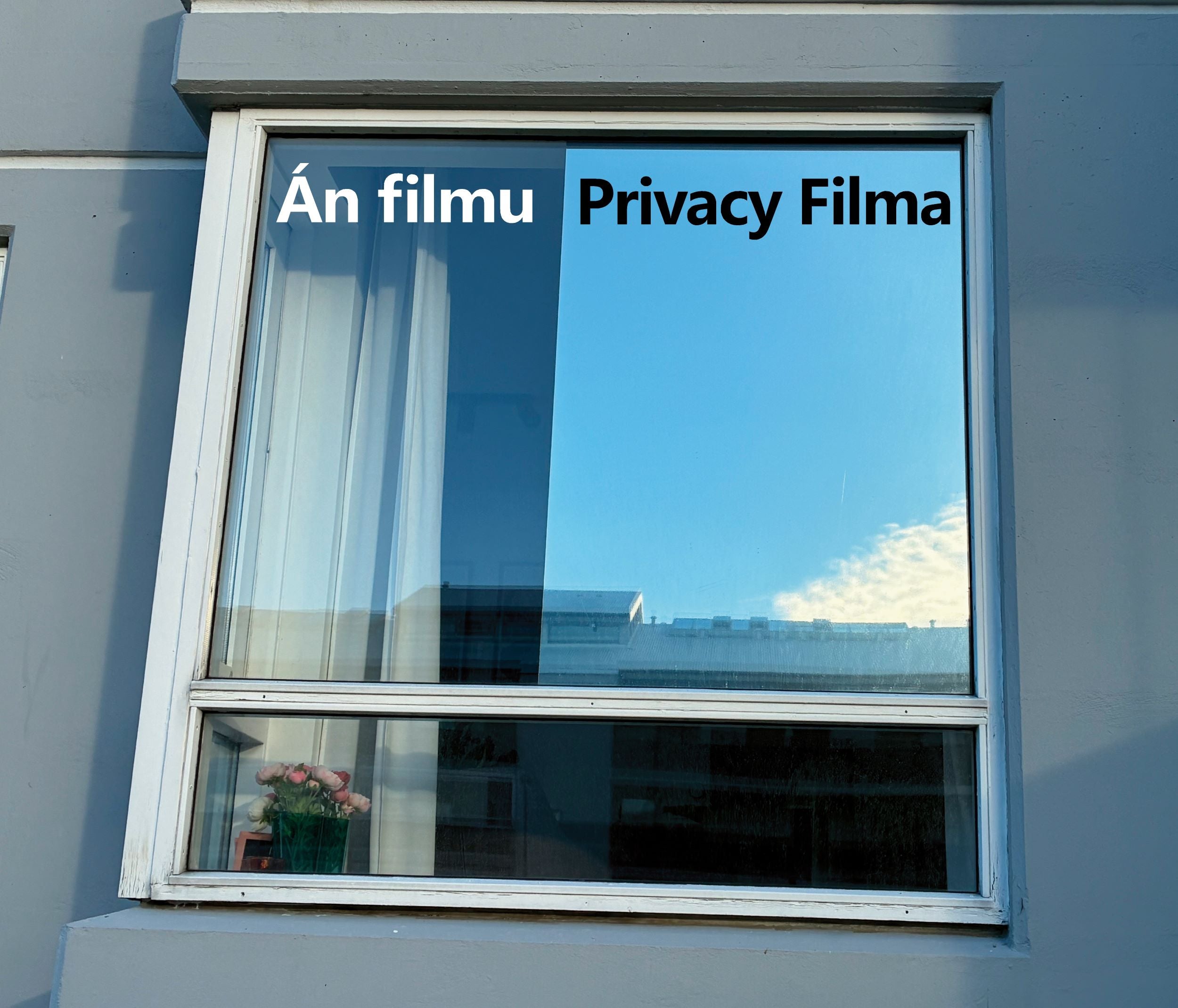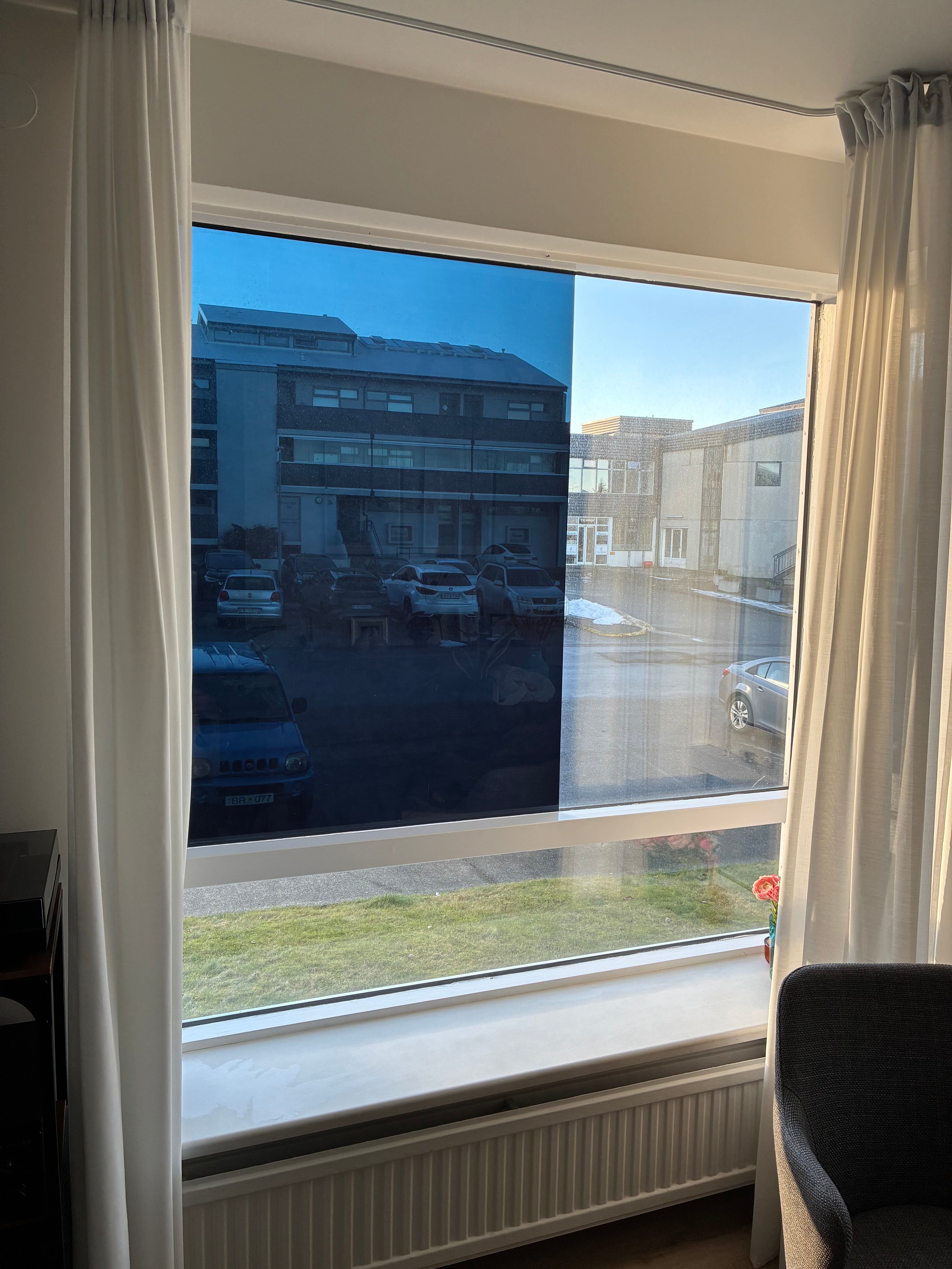 Ekki hugsað sem sólarfilma en þó dregur vel úr birtu fyrir þá sem vilja það og á daginn sést ekkert í geng utan frá séð.